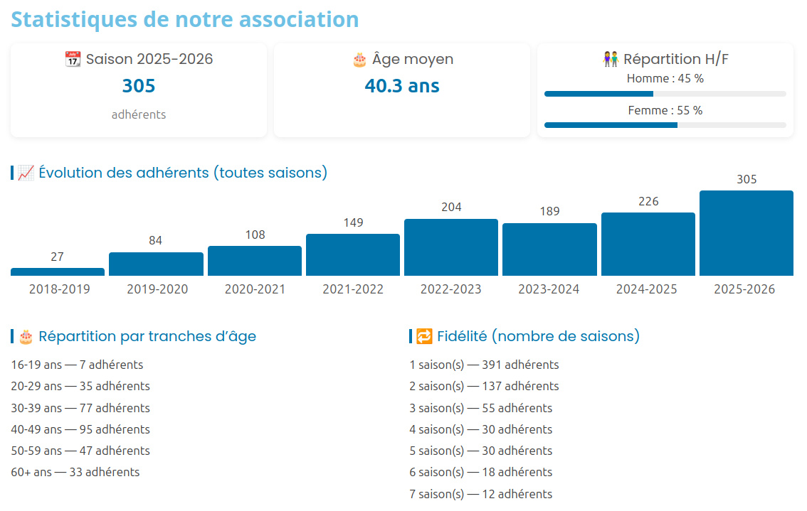Plus de 4 100 membres sur notre groupe public Facebook et 305 adhérent·e·s pour la saison 2025-2026 (un record 🎉) ! Une belle mixité : 55% femmes, 45% hommes, âge moyen 40 ans. Les adhérents bénéficient d’un groupe privé dédié 🔒.