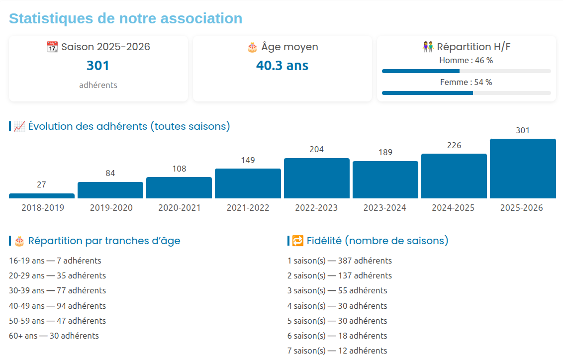 Plus de 4 100 membres sur notre groupe public Facebook et 301 adhérent·e·s pour la saison 2025-2026 (un record 🎉) ! Une belle mixité : 54% femmes, 46% hommes, âge moyen 40 ans. Les adhérents bénéficient d’un groupe privé dédié 🔒.