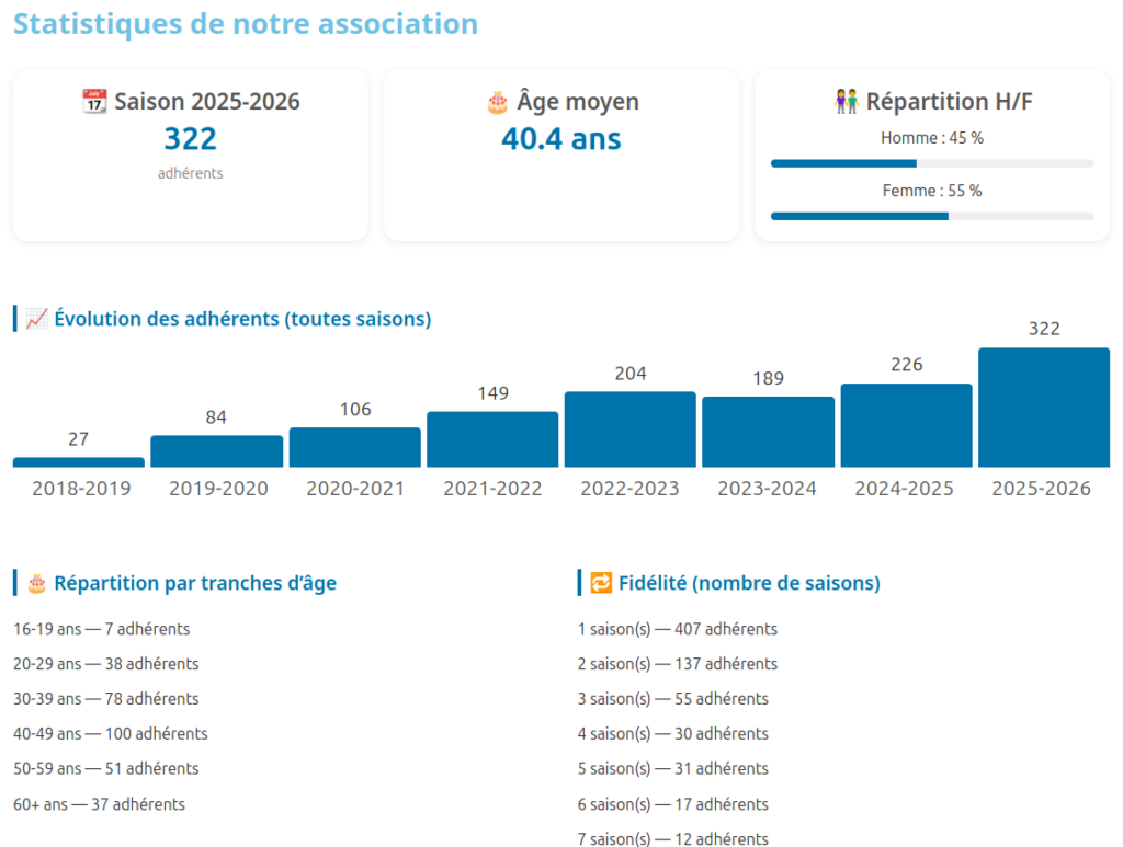 Plus de 4 200 membres sur notre groupe public Facebook et 322 adhérent·e·s pour la saison 2025-2026 (un record 🎉) ! Une belle mixité : 55% femmes, 45% hommes, âge moyen 40 ans. Les adhérents bénéficient d’un groupe privé dédié 🔒.