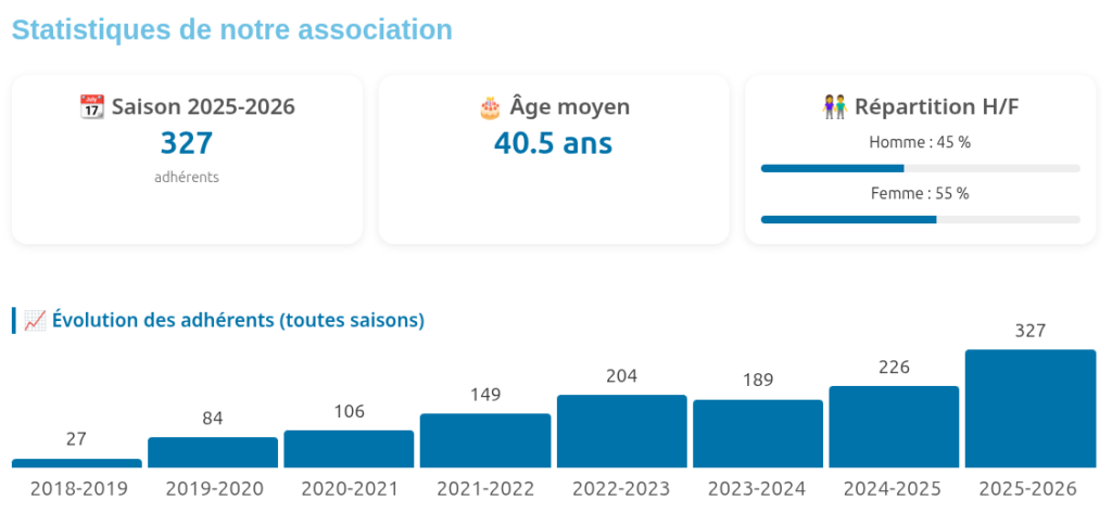 – 327 adhérents pour la saison 2025–2026 (+100 adhérents en un an),